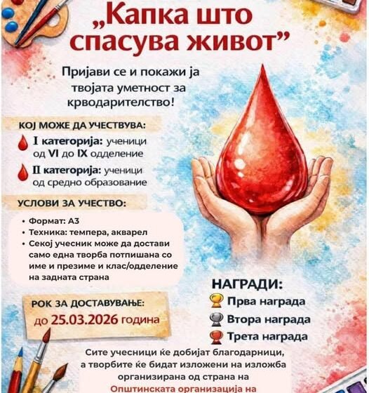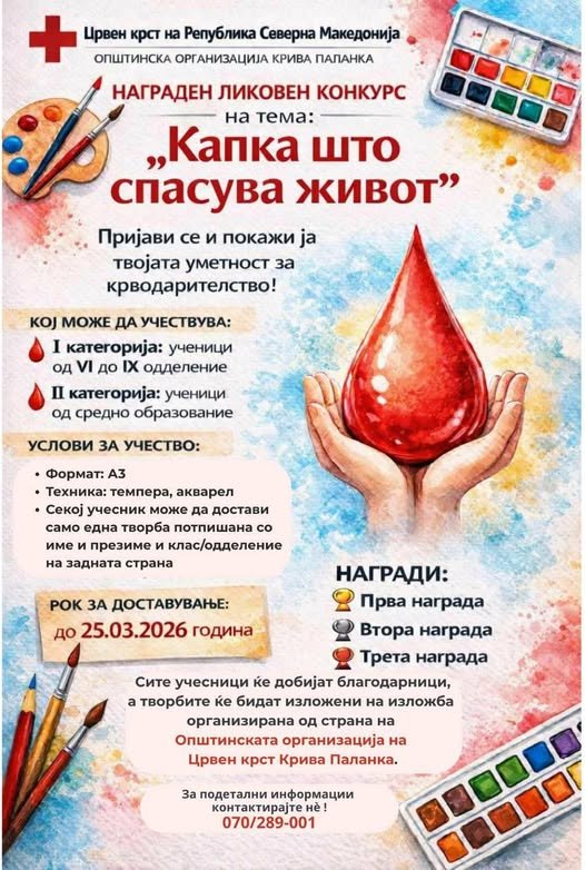 По повод 17 Март – Денот на крводарителството, Општинската организација на Црвен крст Крива Паланка распишува ликовен конкурс на тема „Капка што спасува живот“.
